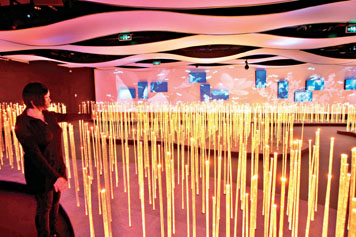 該館整體LED燈管約有11萬(wàn)米,能夠形成三維的顯示矩陣。從5月1日開始,每天晚上閉館之前,將有這樣一個(gè)8分鐘左右的秀。經(jīng)歷一個(gè)“魔方”蘇醒的過(guò)程,觀眾會(huì)聽到“魔方”的“心跳”,當(dāng)“讓我們蕩起雙槳”音樂片段配合著企業(yè)聯(lián)合館的三維畫面,過(guò)去的片段在腦海中浮現(xiàn)。