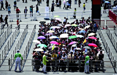 世博園6號(hào)入口位于世博軸南端,是世博園最主要的入口之一。昨日8時(shí)45分,入口處已聚了數(shù)百名游客。安檢口共64個(gè),其中東西兩側(cè)的10個(gè)入口是無(wú)包游客的快速通道。