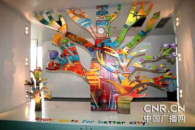 講解員說這些東西取材于俄羅斯全國兒童繪畫大賽的獲獎作品,他們共同的主題是《我眼中的最佳城市》:一座座房子蓋在烏龜上,城市可以移動;有的樹上也蓋了房子,張開的樹枝就是一條條馬路。孩子們心中的未來城市真是充滿了想象力和童趣,這樣的設(shè)計也受到了正在參觀的孩子們的喜歡。