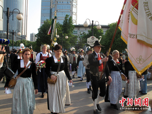 中新網(wǎng)南京5月23日電(申冉 閆正偉)今天下午,南京市中心山西路的市民廣場(chǎng)上空飄蕩著來(lái)自?shī)W地利美麗山崗原野間的優(yōu)美圓舞曲,穿著奧地利民族服裝的奧地利施瓦茨市長(zhǎng)樂團(tuán)樂手們帶著他們淳樸悠揚(yáng)的旋律和歡快自由的舞步,給南京市民送來(lái)了一個(gè)充滿著奧地利音樂狂歡節(jié)日氣氛的初夏周末。