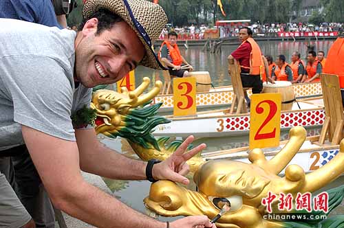 中新網(wǎng)蘇州6月15日電(趙龍)鑼鼓聲中,世博會(huì)智利館代表Tomas興奮地拿起手中的毛筆,對(duì)著龍眼點(diǎn)了一筆,整條龍舟頓時(shí)“活”了起來!船員們報(bào)以熱烈掌聲,Tomas激動(dòng)地舉起雙臂:“加油!”