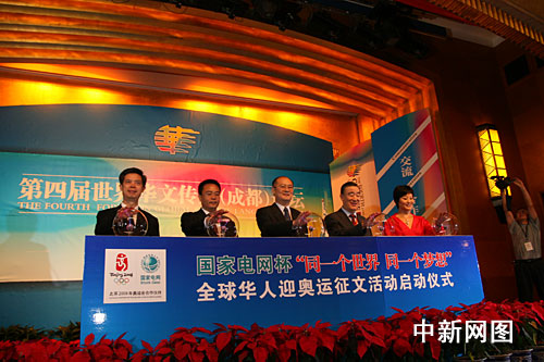 在第四屆世界華文傳媒論壇成功舉辦之際,中國(guó)國(guó)家電網(wǎng)公司和中國(guó)新聞社共同主辦的“國(guó)家電網(wǎng)杯‘同一個(gè)世界同一個(gè)夢(mèng)想’――全球華人迎奧運(yùn)征文”活動(dòng)今天正式啟動(dòng)。作為此次活動(dòng)的支持單位,我代表國(guó)務(wù)院僑務(wù)辦公室對(duì)這一意義重大的活動(dòng)表示熱烈的祝賀,預(yù)祝并相信活動(dòng)將取得圓滿成功。