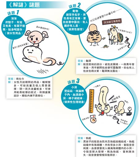 負(fù)責(zé)策劃《解謎》的家計會教育干事陳耀杰表示,《解謎》的版面設(shè)計十分可愛,從封面到內(nèi)頁都輔以不少生動的漫畫,希望吸引小朋友閱讀,該書采一問一答形式,方便家長和教師與小朋友打開話題,輕松無尷尬地談性,“家長可先猜猜謎,由謎語游戲開始,玩一會才向子女灌輸性教育”。