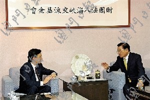 譚俊榮二十四日下午在臺(tái)北禮節(jié)性拜會(huì)海基會(huì)董事長(zhǎng)江丙坤,受到熱情接待。雙方深入交換了深化澳臺(tái)關(guān)系發(fā)展,促進(jìn)兩地文化、觀光、旅游、經(jīng)濟(jì)等交流的意見(jiàn)。江丙坤明確表示,支持特區(qū)政府推動(dòng)澳臺(tái)關(guān)系發(fā)展。愿意發(fā)揮;鶗(huì)的作用和影響力,協(xié)助特區(qū)政府與臺(tái)灣有關(guān)方面磋商在臺(tái)設(shè)立辦事處及澳門高校學(xué)歷認(rèn)可等事宜。