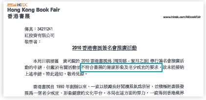 據(jù)香港明報報道,書展今屆共收到約130多宗簽名活動申請。貿(mào)發(fā)局傳媒及公關部發(fā)言人張志輝表示,“香港書展文化活動顧問團”大半年前已成立,成員來自文化、出版、教育和傳媒界共13人,昨經(jīng)過早上開會后,決定拒絕不超過10宗簽名會申請。