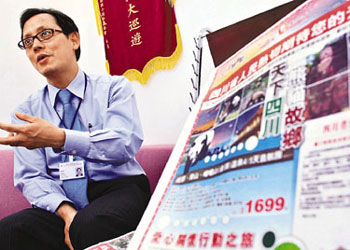 中旅社業(yè)務(wù)部副總經(jīng)理吳熹安表示,四川省旅游局宣布部分旅游景點恢復(fù)接待游客,故集團(tuán)實時推出低至7折、團(tuán)費由1699元起的四川4天優(yōu)惠團(tuán),另推出團(tuán)費2799元的5天愛心關(guān)懷團(tuán),行程除了傳統(tǒng)的樂山、峨眉山外,亦安排團(tuán)員參觀地震災(zāi)區(qū)民眾暫住的“溫馨家園”,讓團(tuán)員向四川人民送暖。