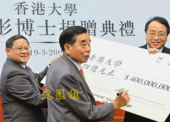 有關(guān)支票捐贈儀式19日于港大舉行,除鄭裕彤外,港大校務(wù)委員會主席馮國經(jīng)、校長徐立之、法律學(xué)院院長陳文敏等均有出席。馮國經(jīng)贊揚(yáng)鄭裕彤一直對教育事業(yè)大力支持,這次捐贈也是對港大每一成員的鼓勵,他對此深表感激。徐立之則指,鄭裕彤的捐款除支持港大“百周年校園”計(jì)劃外,也有點(diǎn)名支持法律學(xué)院,對學(xué)院發(fā)展幫助甚大。