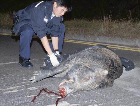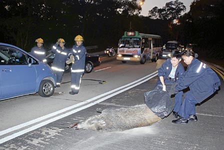 這頭大野豬近5呎長(zhǎng),雄性,重約400磅,體型非常巨大,需5名消防員合力才勉強(qiáng)將豬尸移到路邊草叢,等候香港食環(huán)署人員拉走處理。