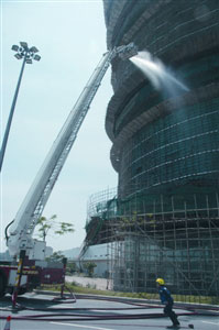起火位置火勢(shì)一度猛烈,滾滾黑煙從地盤涌出街外,直卷半空,遠(yuǎn)至立法會(huì)大樓也可清楚看見,狀甚嚇人。事發(fā)于16日下午1時(shí)許,大批消防員、救護(hù)員及治安警接報(bào)趕抵現(xiàn)場(chǎng),消防員到場(chǎng)即在亞馬喇圓形地近舊澳氹大橋口升起云梯向著火的棚架及安全網(wǎng)射水撲救,防止火勢(shì)蔓延。