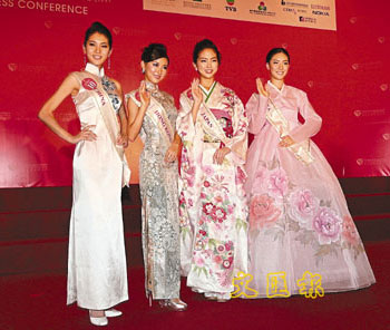 來自世界各地的63位佳麗身穿代表地區(qū)的民族服出場,分組讓傳媒拍照。28日以身穿大露背晚裝的意大利小姐最為性感,去年的國際小姐冠軍墨西哥小姐28日也有出席記者會,但卻失儀露底走光。