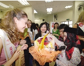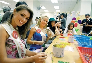中新網10月30日電 據澳門日報報道,63位國際小姐候選佳麗29日到澳門扶康寶翠中心探訪智障人士。佳麗們除參觀中心設施外,并共同參與扶康學員日常的訓練及工作,為弱勢社群獻上關懷。