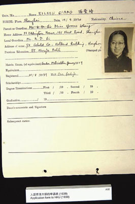 這次展覽的多數(shù)展品,是由宋以朗先生提供,如有張愛玲親筆簽名的《傾城之戀》等著作以及《談色.戒》初稿!俺醺濉北砺稄垚哿峄貞诋斈昱_灣《中國時報》內署名“域外人”對《色.戒》的批評。是次展覧,香港大學則展示了張愛玲的入學證明,上面附有她戴著圓厚眼鏡的學生照。但上面的出生日期為九月十九日,與后來她申請美國綠卡時所填的九月三十日不同。