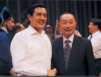 圖:馬英九觀看梅派名劇后上臺與梅葆玖握手。(圖片來源:大公報(bào))