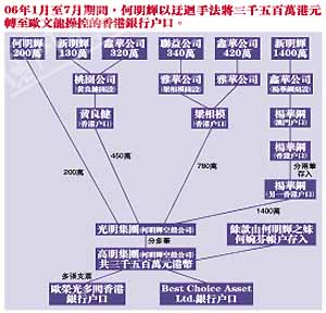 在最初階段,何明輝涉向歐文龍行賄時,一般只是透過新明輝的二判商、公司職員或何明輝妹妹何婉芬,經(jīng)一兩層清洗后,賄款已去到由歐文龍所操控的香港銀行賬戶內(nèi)。自○五年九至十一月期間,何明輝涉向歐文龍交付一筆三千一百多萬港元款項時,過程開始轉(zhuǎn)趨迂回復(fù)雜。何明輝先將賄款轉(zhuǎn)入旗下二判商后,再由新明輝經(jīng)理楊華鋼所開設(shè)鑫華公司收集賄款,由楊華鋼本人賬戶多次匯款后,方去到歐文龍操控的Ecoline Property Limited香港銀行賬戶。