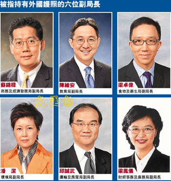 有傳媒28日引述“接近政府消息人士”稱,除候任商務及經(jīng)濟發(fā)展局副局長蘇錦梁被指持有加拿大護照外,另有5名候任副局長也被懷疑持有外國的居留權(quán),包括候任教育局副局長陳維安、食物及衛(wèi)生局副局長梁卓偉、環(huán)境局副局長潘潔、運輸及房屋局副局長邱誠武、財經(jīng)事務及庫務局副局長梁鳳儀等,使事件更令人關注。