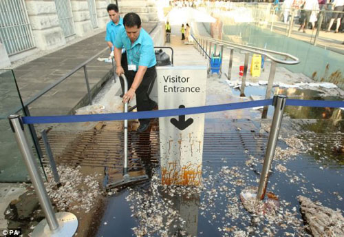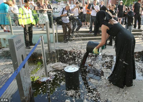 抗議者選擇泰德美術(shù)館開夏日聚會的時候,來到美術(shù)館門口表達(dá)自己的不滿,呼吁美術(shù)館盡快停止接受贊助。一些人手持印有BP字樣的原油桶,往美術(shù)館入口處的空地上潑灑石油和羽毛。頓時美術(shù)館門口滿眼狼籍,吸引了很多的過路人。