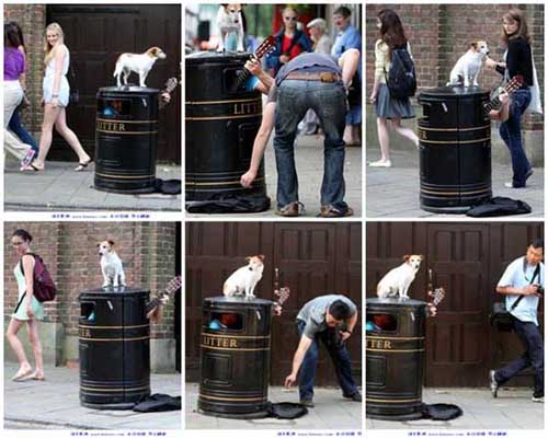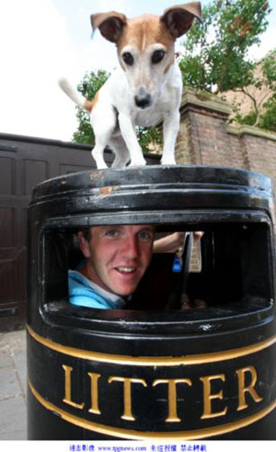 中新網(wǎng)7月8日電 據(jù)臺(tái)灣“今日新聞網(wǎng)”7日報(bào)道,英國一位知名的街頭藝人查理卡維(Charlie Cavey)總是躲在垃圾桶里自彈自唱。但這種表演方式行動(dòng)不便,賞金時(shí)常被偷走或搶走,于是最近找來一只杰克羅素犬“歐比”(Obi)幫他把風(fēng)。歐比乖巧的模樣,令人聯(lián)想到在唱片上有超過100年歷史的知名LOGO。