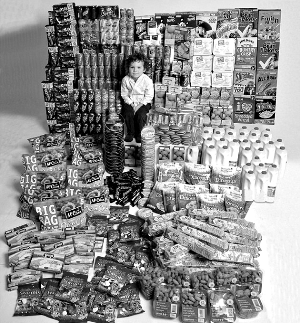 12日,英國(guó)媒體刊登了一份英國(guó)食品標(biāo)準(zhǔn)機(jī)構(gòu)和營(yíng)養(yǎng)調(diào)查機(jī)構(gòu)共同統(tǒng)計(jì)的數(shù)據(jù),數(shù)據(jù)統(tǒng)計(jì)了4到10歲兒童平均每人一年內(nèi)所食用的包括蛋糕、冰激凌等在內(nèi)的“垃圾食品”的數(shù)量,并將所有這些放在一起拍了張照片。據(jù)統(tǒng)計(jì)每名兒童一年平均吃5840克餅干、8030克蛋糕、4380克奶酪、5840克冰激凌等。(綜合)