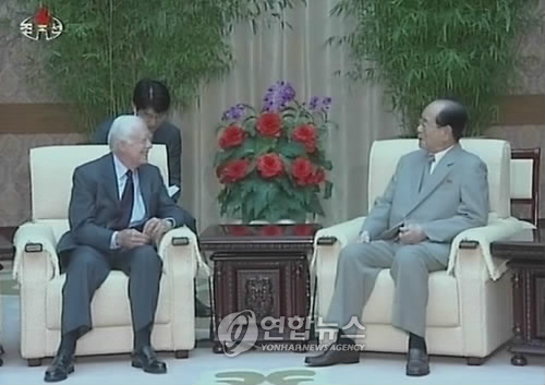 報(bào)道稱,金永南和卡特在溫馨的氛圍里進(jìn)行了交談。六方會(huì)談朝鮮代表團(tuán)長(zhǎng)金桂冠等人出席了會(huì)晤。
