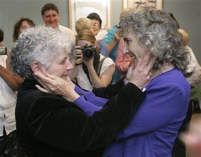 16日,一對(duì)共同生活了34年的女同性戀人在加州合法結(jié)婚。