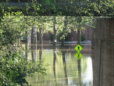 愛荷華市的洪水水位仍在上升,圖為該市大學藝術(shù)學院校園道路指示牌。