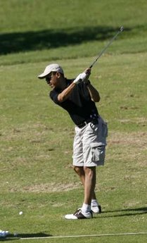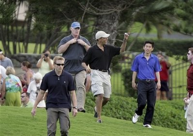奧巴馬在夏威夷瓦馬納羅完整地打了18洞,球場(chǎng)標(biāo)準(zhǔn)桿為72桿。不過,美國(guó)新任總統(tǒng)18洞打出的桿數(shù)沒有被曝光。雖然奧巴馬在夏威夷開球時(shí)用了一根很強(qiáng)勁的一號(hào)木,不過他的真實(shí)水平如何還是個(gè)謎。不過,有一點(diǎn)可以肯定,奧巴馬打高爾夫時(shí)是個(gè)左撇子,他在第9洞停下來(lái)休息時(shí)吃了一些點(diǎn)心。在被問到球打得如何時(shí),奧巴馬笑著回答,“打得沒那么好!