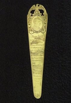 據(jù)稱,這枚金書簽具有特殊的歷史價值,它是希特勒的情人愛娃1943年送給希特勒的禮物,書簽上方雕刻著希特勒的臉,此外還有棲息在納粹十字記號上的鷹圖案,書簽上的題字還提到了1943年1月31日德軍在斯大林格勒戰(zhàn)敗后向前蘇聯(lián)軍隊投降的事件,因此,有人認為愛娃送希特勒這枚書簽是為了安撫希特勒當時沮喪的心情。