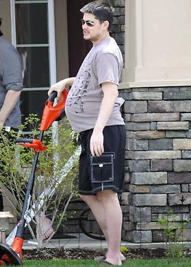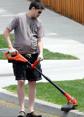 留著胡子的他盡管懷孕,仍堅(jiān)持勞動,修整家里的草坪。