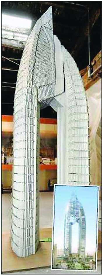 薩瓦亞此次是受迪拜塔的開發(fā)商、阿聯(lián)酋納克希爾地產(chǎn)公司的委托,進(jìn)行這項(xiàng)藝術(shù)創(chuàng)作的。預(yù)計(jì)這一坐落于迪拜市棕櫚島上的世界最高建筑將超過七百米高,于二○○八年底竣工,明年九月正式對外開放。