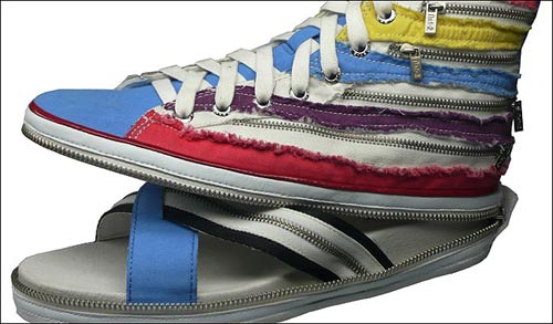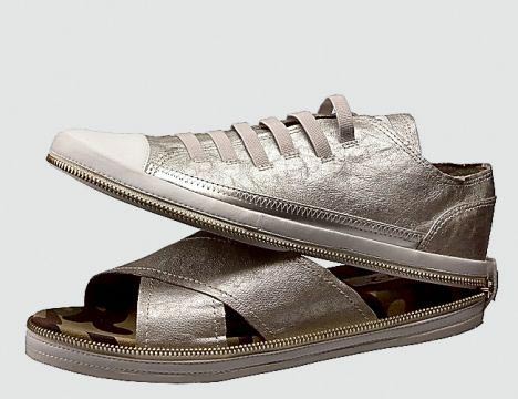 這種多變鞋被稱為Nat-2,它看上去就象一雙普通的匡威牌帆布鞋。但如果你想讓腳透氣,只需解開拉鏈,這時呈現(xiàn)在你面前的就是一雙涼鞋了。帆布鞋的上部能夠很容易地折疊起來,放進(jìn)包里。目前有20種不同的樣式可供選擇,人們可以根據(jù)自身喜好選擇不同的款式進(jìn)行搭配。該創(chuàng)意很可能來自于20世紀(jì)80年代的動畫片變形金剛。然而與這些到處都能買到的塑料機(jī)器人不同的是,人們很難找到出售Nat-2鞋子的商店。目前,在英國唯一取得該鞋子經(jīng)營權(quán)的是位于倫敦西南部亭克漢姆(Twickenham)的 Wild Goose。每雙鞋子的售價為59.99英鎊。
