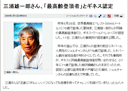 去年5月26日,當(dāng)時(shí)75歲的三浦一郎成功登頂珠穆朗瑪峰。據(jù)悉,之前吉尼斯世界紀(jì)錄珠峰最高齡登頂者也是一位日本登山家,名為柳澤勝輔,2007年以71歲高齡登頂成功。