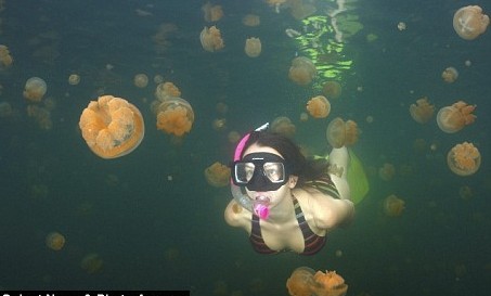 無毒水母為食草性,主要是靠海藻分泌的營(yíng)養(yǎng)素維生,因此水母散發(fā)著淡淡的橘色光茫,湖中亦有大群的銀面魚及透明的月亮水母,全都是溫和無毒的。