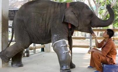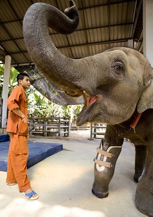 中新網(wǎng)3月10日電 據(jù)英國(guó)《每日郵報(bào)》報(bào)道,在泰國(guó)南邦府,一只亞洲象兩年前不幸觸雷后,前右腿慘遭炸毀。后來(lái)這只亞洲象安裝上假肢,不久將可重返叢林生活。