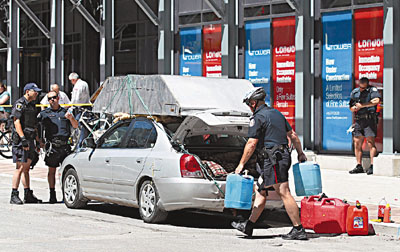 中新網(wǎng)6月26日電 據(jù)香港《文匯報(bào)》26日?qǐng)?bào)道,G20峰會(huì)前夕,各成員國(guó)領(lǐng)袖陸續(xù)抵,加拿大警方在多倫多市采取極嚴(yán)密保安措施。連日來(lái)已有3名可疑人士被捕,其中1名53歲男子前日駕車經(jīng)過(guò)峰會(huì)會(huì)場(chǎng)禁區(qū),由于車頂綁著1個(gè)鋼制儲(chǔ)物箱,模樣怪異,引起警方注意。警察攔車檢查,赫然發(fā)現(xiàn)車上有十字弓、電鋸、棒球棍、大錘外,還有多種不明液體。警方?jīng)]收這批物品,并將他拘捕。