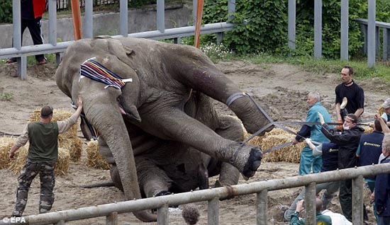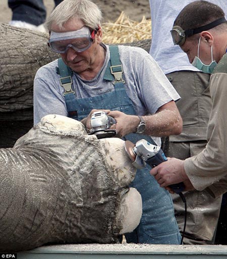 這只名為“男孩”的亞洲象今年已經(jīng)39歲了,他的腳趾甲太長了以至于他一直感覺很不爽,動物園的工作人員看在眼里疼在心上,專門花重金從德國請來一名獸醫(yī)和他的多位助手,為“男孩”修理指甲。
