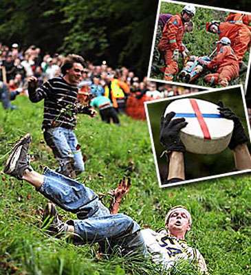 今年共有200名參賽者,他們要冒險從坡度達(dá)一比二的庫珀山山坡滾下來,有的參賽者滾到兩腳朝天。據(jù)估計(jì),這場比賽吸引了約一萬人到場觀看。能夠完成賽事而沒有受傷的參賽者已屬難得,因?yàn)樗麄円獜陌纪共黄降纳狡聺L下來,很容易會扭傷腳踝或骨折。