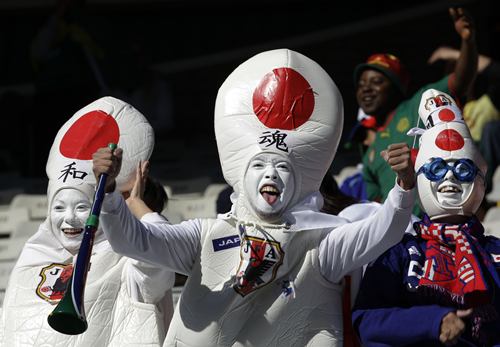 不過,除了這些美女,世界杯賽場的女球迷也以一些令人匪夷所思的造型出現(xiàn)在公眾面前。報道指出,以日本女球迷為例,全身“裹粽子”般包得緊緊地,如同將相撲的服裝穿在身上,令人看不懂她們追求的效果是什么。看上去,她們的造型像是“安全套”,又像是保齡球瓶,和足球賽仿佛搭不上調(diào)。不過,唯一能確定的是,她們在冬天的南非應(yīng)該不會受涼。