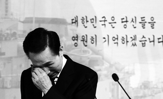 “身為總統(tǒng),我要將天安艦沉沒原因一查到底,徹底查明真相……”說到這里,身著黑色西裝的李明博聲音開始哽咽,隨后他從右邊褲兜中掏出藍色的手絹擦了擦鼻子,然后繼續(xù)語氣堅定地說:“調查結果出來后,我們要堅定不移地采取果斷措施!