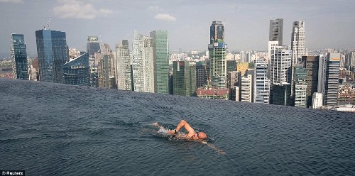 報(bào)道稱,建在樓頂?shù)挠境乜雌饋?lái)如同水面延伸到地平線一般壯觀。你可以一邊游泳,一邊俯瞰新加坡靚麗的城市風(fēng)光。從泳池溢出的水會(huì)滲入到特別設(shè)計(jì)的集水區(qū),并通過(guò)水泵和水處理系統(tǒng)重新回到泳池中。