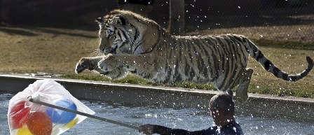 游戲一直很安全地進(jìn)行。一只老虎的體重可達(dá)到47英石(約300公斤重),但嬉戲時(shí)它不會(huì)伸出爪子去抓人。泳池里也總是有2名管理員隨時(shí)關(guān)注情況,不讓樂趣變成悲劇。