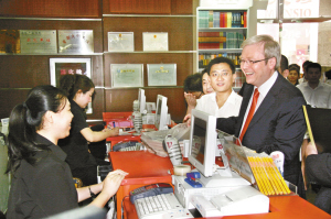 陸克文總理在北京王府井書(shū)店收款臺(tái)交款。 北發(fā) 攝