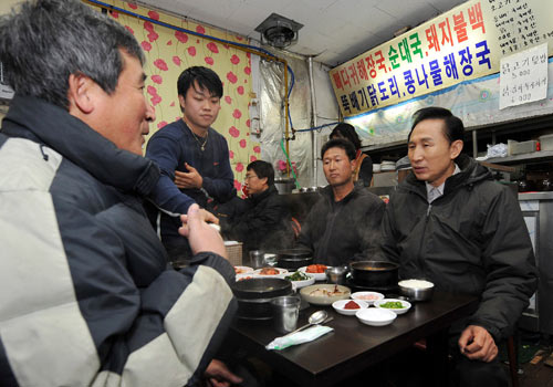 李明博為了吃早餐去了餐廳,在餐廳向一名民眾問起景氣問題時,該民眾回答:“我都沒有錢吃飯。”。