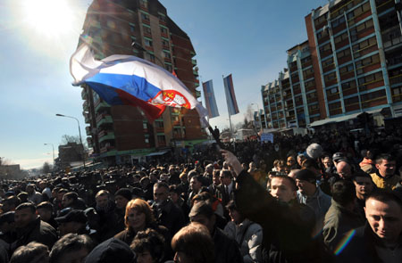 19日中午,幾千名塞族學(xué)生在大橋北岸游行,塞爾維亞國(guó)旗迎風(fēng)飄舞。游行是在12點(diǎn)44分開(kāi)始的,寓意是聯(lián)合國(guó)安理會(huì)第1244號(hào)決議。該決議重申南聯(lián)盟(主權(quán)地位后為塞爾維亞繼承)對(duì)科索沃地區(qū)擁有主權(quán)。