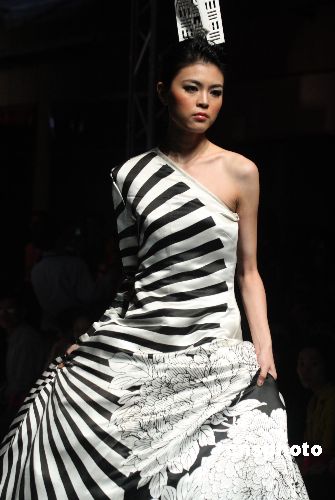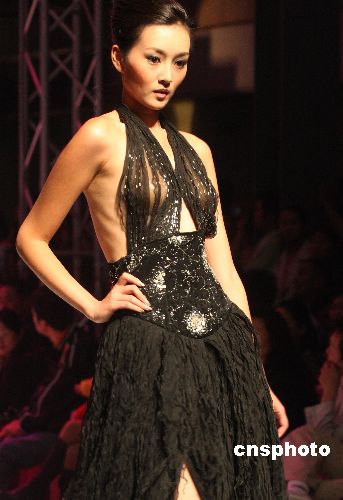 10月26日晚,在湖北武漢舉行的“2007佳海杯中國國際服裝(院校)設計大獎賽”推出流行趨勢發(fā)布會專場,來自中國香港的設計師李國華、中國內地頂級設計師吳海燕、杭州的張義超、設計師顧林等五位設計師演繹不同風格的“東方神韻”最新力作。作品既保持民族性,又不失時尚性,呈現(xiàn)出多變靈動的服飾風格,通過新絲路模特的演繹,預告了20007-2008年的時尚走向。圖為模特展示中國服裝設計師最新流行作品。中新社發(fā) 錢興強 攝