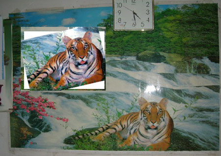 前晚9時(shí),網(wǎng)友“攀枝花xydz”在“打虎派”大本營色影無忌華南虎臨時(shí)論壇發(fā)帖說,“周老虎”的原形是一副老虎年畫,除耳朵不一樣外,哪里都一樣,甚至連老虎紋路都是一樣。各路高手將年畫老虎與“周老虎”進(jìn)行比對,得出是同一只老虎的結(jié)論。
