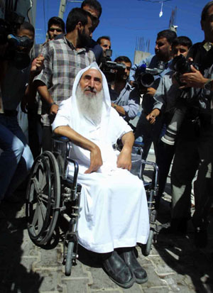 2005年6月,我見(jiàn)到亞辛,白衣老人坐在輪椅上,看起來(lái)十分瘦小,兩只手無(wú)力地垂在胸前。銀白的胡須、凌厲的鷹鉤鼻。他的聲帶顯然受損,聲音好像一把刀片刮在玻璃上,尖利卻不清楚。如果你距離他超過(guò)一米就根本聽(tīng)不見(jiàn)他在說(shuō)什么。藍(lán)灰色的眼珠看起來(lái)有些渾濁。有時(shí)他仰頭向上看,嘴唇微微張開(kāi),眼神呆滯;有時(shí)他的眼珠又異常靈活,發(fā)出冷冷的光。兩種表情在他臉上交替出現(xiàn)。8年的牢獄生活使亞辛的身體狀況進(jìn)一步惡化,視力、聽(tīng)覺(jué)嚴(yán)重受損,完全癱瘓。
