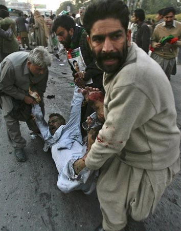 中新網(wǎng)12月27日電 據(jù)法新社報(bào)道,巴基斯坦前總理貝-布托今日在競(jìng)選集會(huì)上遭到炸彈襲擊,不治身亡。圖為集會(huì)參與者在參與救援。(關(guān)新)