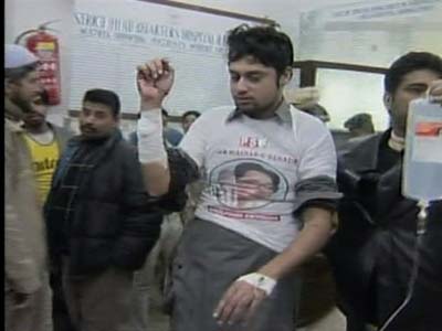 中新網(wǎng)12月28日電,據(jù)法新社報道,巴基斯坦前總理貝-布托27日在競選集會上遭到炸彈襲擊,不治身亡。圖為貝-布托的支持者被送往醫(yī)院。(關(guān)新)