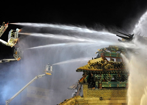 2月11日,在韓國首爾市中心的崇禮門殘骸附近,韓國候任總統(tǒng)李明博到現(xiàn)場視察。韓國各界對國寶級建筑崇禮門在當(dāng)天凌晨被焚毀感到十分痛心,對火災(zāi)原因表示關(guān)注。