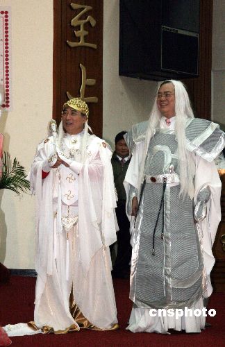 臺(tái)灣第七屆“立法院”十二日舉行新春團(tuán)拜,院長王金平、副院長曾永權(quán)分別扮演布袋戲角色。王金平扮演的是“一頁書”,這個(gè)角色是象征正道的精神指標(biāo);曾永權(quán)扮演“葉小釵”,象征一個(gè)耿直專一、守信重諾的俠客。中新社發(fā) 徐長安 攝